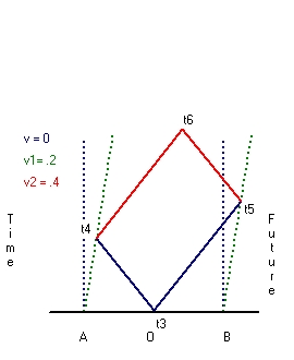 Space ship A will move towards point O and Space ship B away from point O. That is why the lightsignal will reach Space ship A first and Space ship B later. As such the moment that point A is reached, is called t4 and the moment that point B is reached, is called t5.