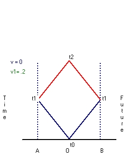 - At t0 we send a light signal, starting from point O towards point A and point B. These lightsignals will reach the points A and B simultaneous at t1. It is important to understand that these are two simultaneous events.